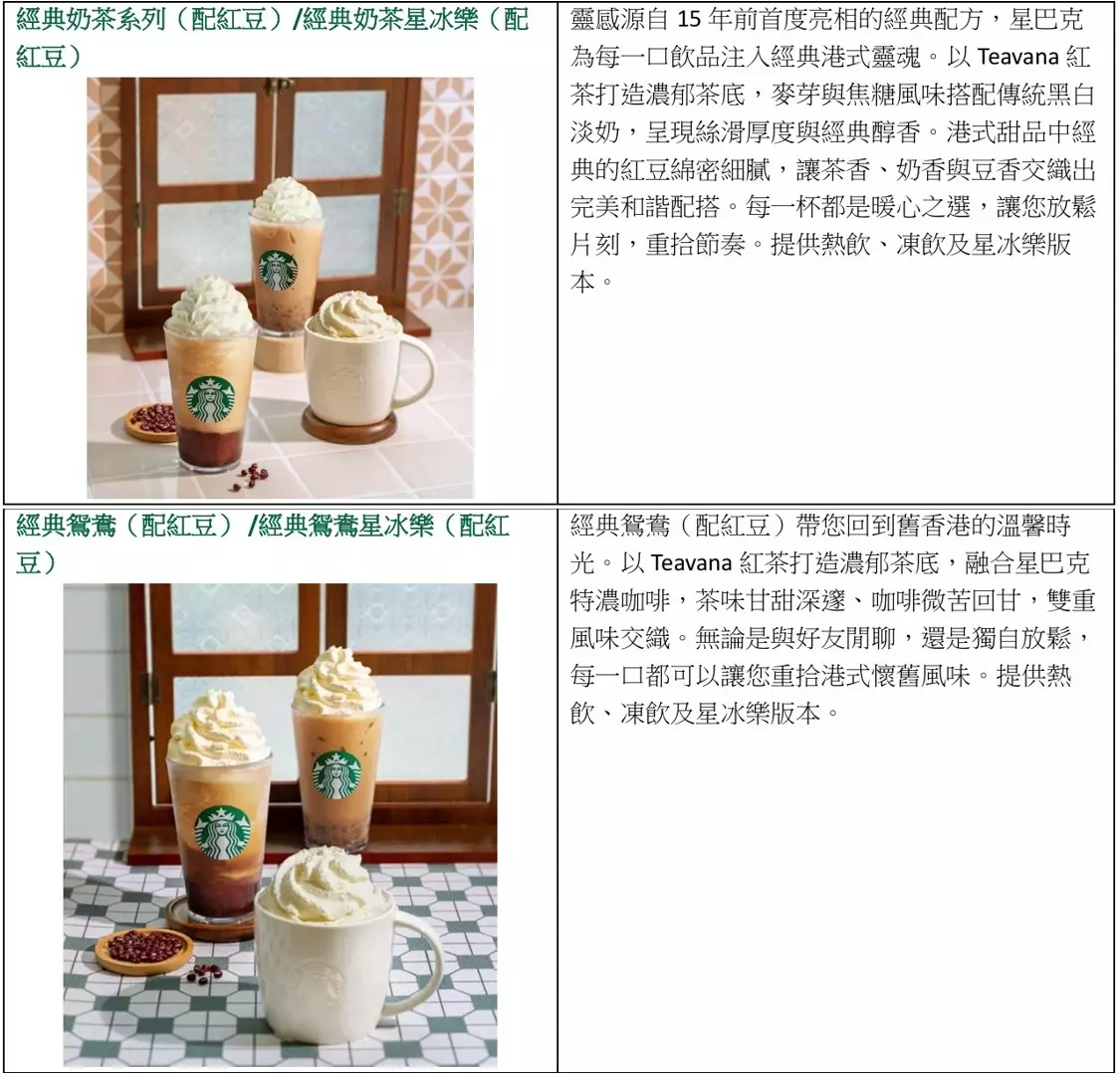 與星巴克一起細味港式文化的懷舊滋味。星巴克重新演繹兩款深受喜愛的經典飲品,為港式經典口 味注入新創意。經典鴛鴦(配紅豆)/經典鴛鴦星冰樂(配紅豆),重現港式鴛鴦的獨特懷舊風味。 靈感源自15年前的經典配方,經典奶茶系列(配紅豆)/經典奶茶星冰樂(配紅豆)讓您重拾昔日情懷,點亮每個歡聚時刻。無論是重溫昔日風光或創造嶄新回憶,這系列飲品以地道風味陪伴您重拾生活節奏與情誼。