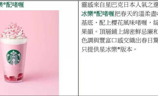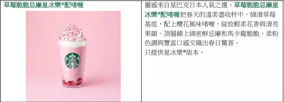 草莓脆脆忌廉星冰樂®配啫喱-靈感來自星巴克日本人氣之選,把春天的溫柔盡收杯中。綿滑草莓基底,配上櫻花風味啫喱,綻放輕柔花香與清亮果韻。頂層鋪上綿密鮮忌廉和馬卡龍脆脆,柔粉色調與豐富口感交織出春日驚喜。