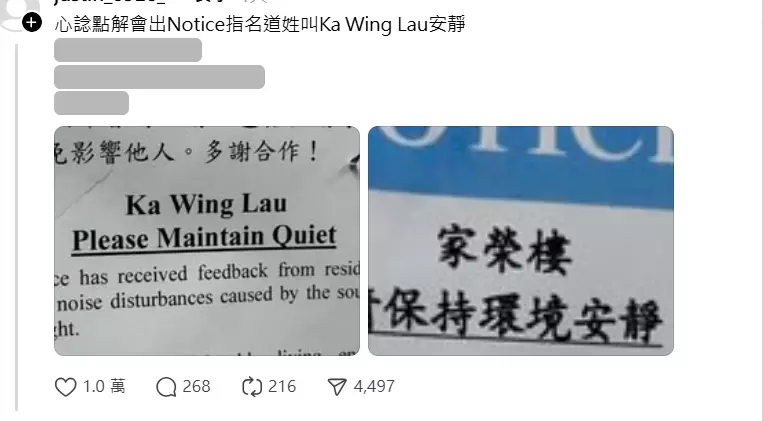 由網民分享的相片所見,一位姓名「Ka Wing Lau」的居民被大廈管理處點名請他保持安靜「Please maintain Quiet」初時網民大感疑惑,不解管理處為何可以公開對方姓名,惟看到中文版的通告時才恍然大悟,原來「Ka Wing Lau」是指家維邨的家榮樓。但管理處錯誤地將樓estate或house,用廣東話譯音直譯Lau,直的令他當場傻眼。「原來Lau等於樓,一直以為叫House,又長知識」。