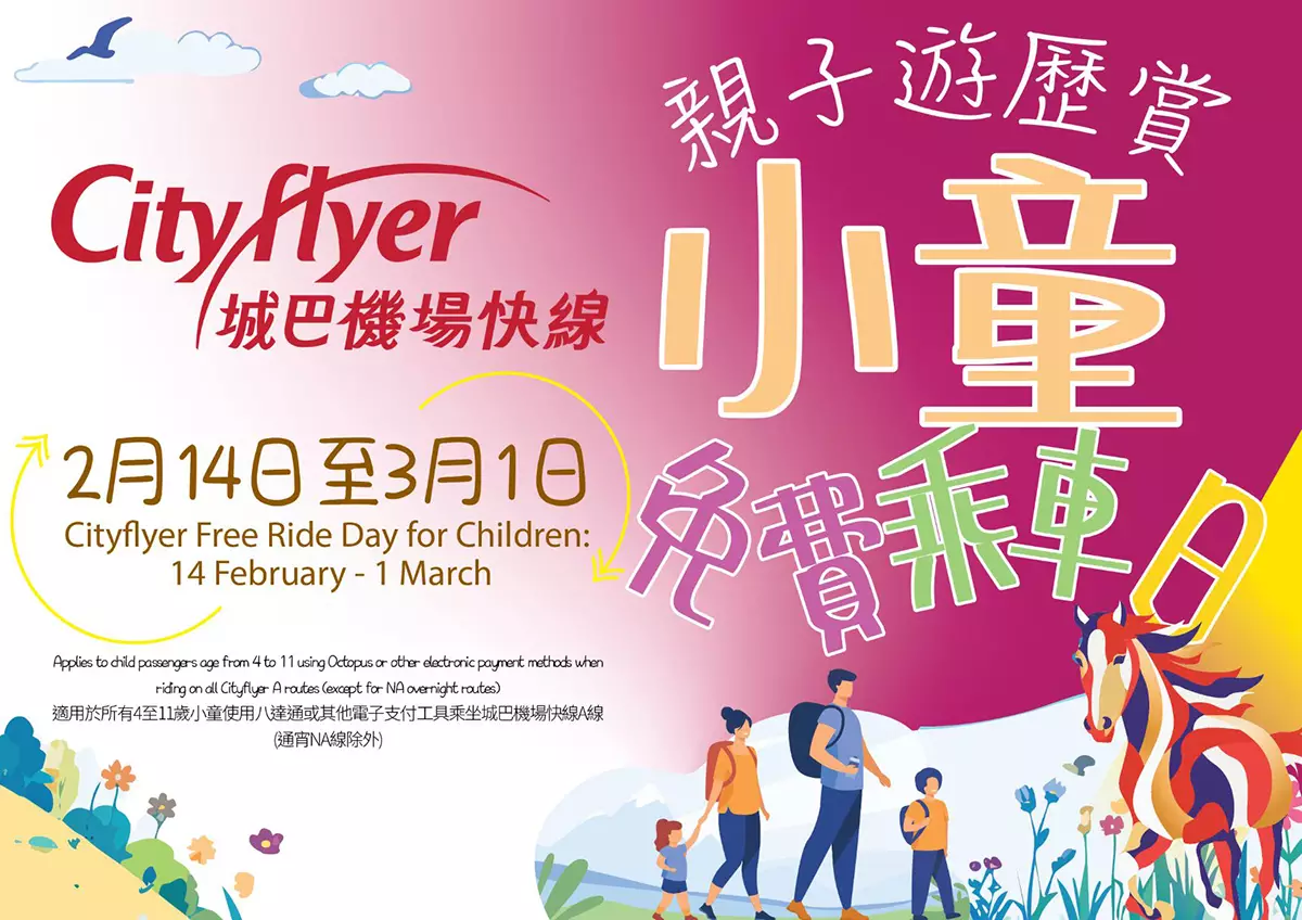 為答謝乘客支持,城巴推出馬年特別版慶祝活動「親子遊歷賞」,共迎「財馬奔騰」新一年。在2月 14 日至3月1日(年廿七至正月十三)期間,所有合資格小童可免費乘搭城巴機場快線,享受為期16日的免費旅程。