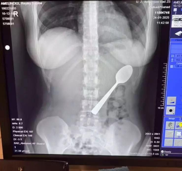 阿美林克斯之後前往醫院求診,醫生表示該匙羹體積過大,無法經自然途徑排出,只能安排胃鏡手術取出。她在家中等候期間,能清楚感覺到匙羹在體內移動,位置接近肋骨,形容不適感相當明顯。經歷約兩日等待後,醫生在局部麻醉下成功將匙羹取出。由於匙羹尺寸問題,手術過程中需多次調整角度,期間引致少量胃部出血。