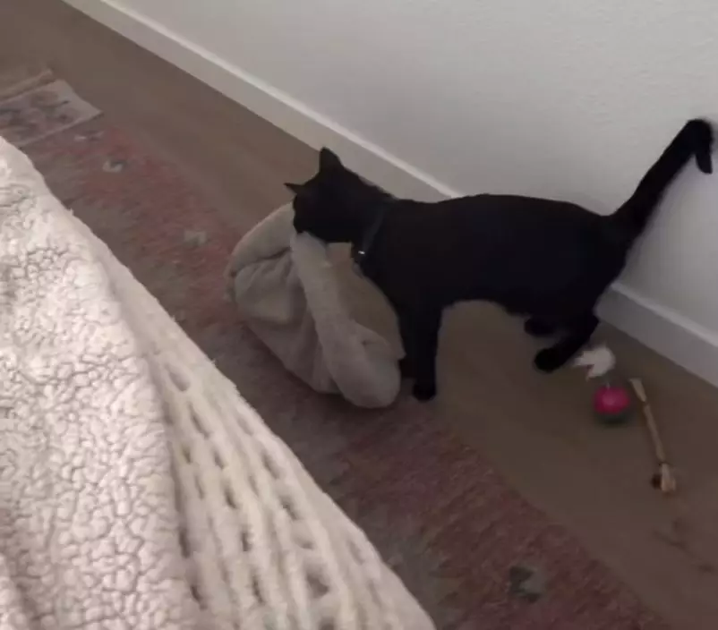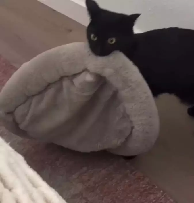 影片可見,西蒙叼起蓬鬆的小床,輕鬆一跳便登上飼主的大床,當場把貓床安置好,為自己打造專屬「床上小窩」。潔西卡對此無奈表示,自己其實飼養了兩隻貓,但因對貓毛嚴重過敏,才特地添置貓床,希望牠們不要再爬上床休息。沒想到這個安排對西蒙毫無效果,反而被牠「升級」成可隨身移動的「行動小窩」,不時拖著小床跟隨自己四處活動。