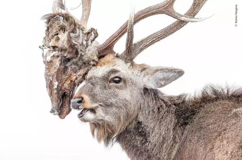 一張令人震撼的野生動物相片,近日入圍倫敦自然史博物館舉辦的「年度野生動物攝影師大賽」觀眾票選獎。照片中,一隻梅花公鹿的鹿角上,竟懸掛著另一隻鹿已腐爛、眼窩深陷的頭顱,畫面驚悚,被命名為「無盡的鬥爭」。