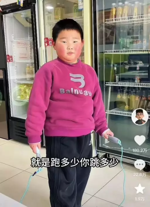 內地一名7歲男童與父親約定影片點讚數多少就跳繩多少下,豈料減肥日常影片意外爆紅,一舉收獲180萬讚。