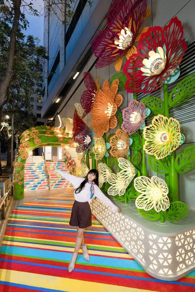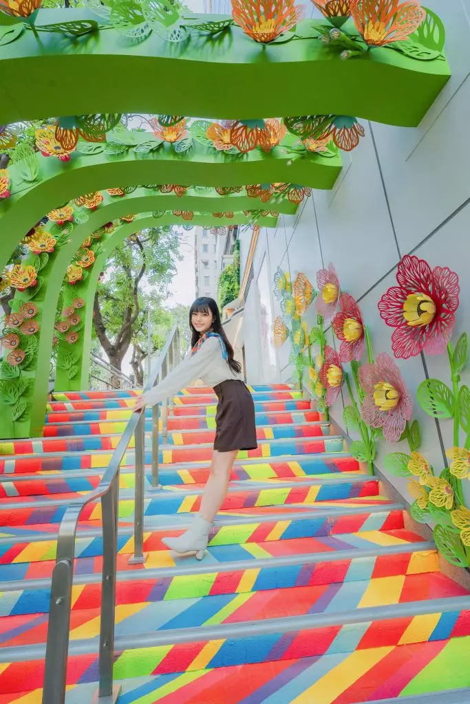 「花之丘」於日與夜會帶來截然不同的感覺,日照時會讓您沉浸於色彩斑斕的珊瑚花卉之中;入夜後柔和的光線穿透珊瑚花營造剪影,亮燈後的「花之丘」加上被光影照亮著的整條彩虹樓梯更顯格外唯美浪漫。必定要到「花之丘」體驗城市綠洲中日與夜之美,「心」活探索藝術的無限可能!