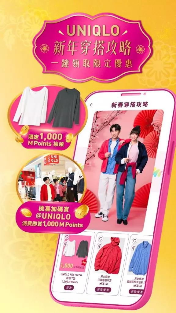 ④ Mira Place更與UNIQLO合作於Mi+ App內推出「新年穿搭攻略」,重點介紹今個新年至潮穿搭,點選心儀商品即可一鍵領取UNIQLO限時禮遇,除了限時以1,000 M Points換領指定UNIQLO HEATTECH圓領T恤乙件,更可領取「桃喜加碼賞@UNIQLO集印卡」,於UNIQLO Mira Place店電子消費滿HK$200或以上,每HK$200消費即可獲得電子印花乙個,集齊5個印花即賞 1,000 M Points!