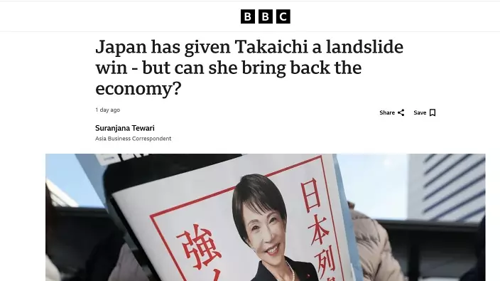 日本首相高市早苗帶領的自民黨,在2月8日眾議院提前選舉中大勝,執政的自民黨在眾議院465個席位中贏得316席位,惟英國廣播公司(BBC)當地時間2月10日的報道卻向高市大潑冷水,質疑究竟高市能否實現日本經濟幾十年來一直未能實現的目標「更快成長」?其中提出兩大疑問:日本那裡有錢和人?直擊要害,另還有涉及中國的問題。