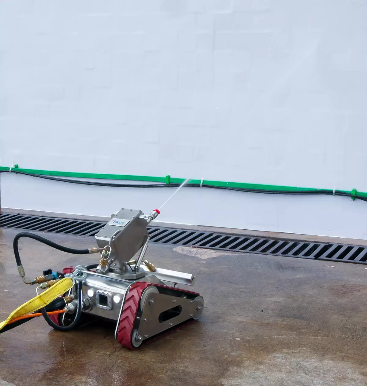 技術解決方案 透過地面控制機械人以高壓水清洗水缸,無需派人進入密閉空間。機械人可拍照或錄影紀錄工作,令管理更為簡易。
