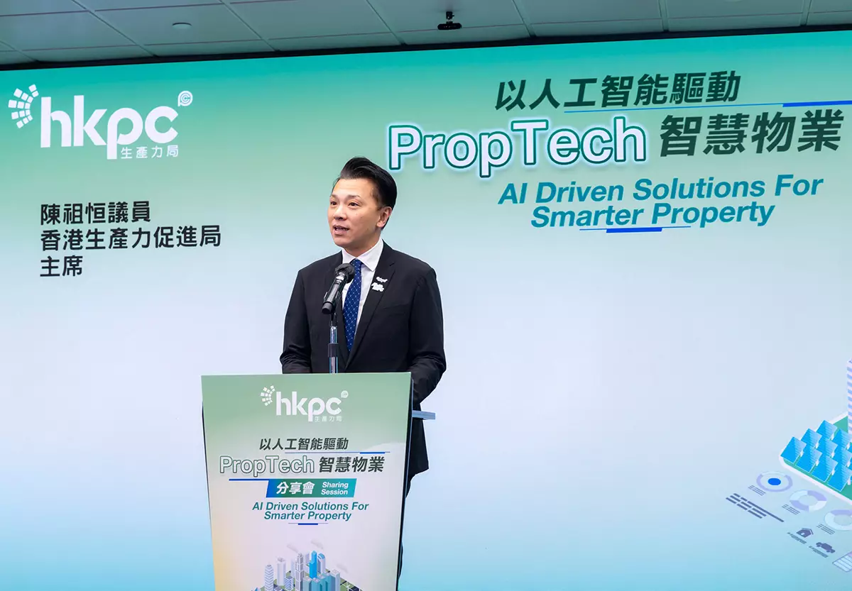 生產力局主席陳祖恒強員致開幕辭時表示,生產力局將透過技術轉移、落地應用與產品創新等支援,協助業業速物物業技技創新,推動香港智慧物業質 量發展。