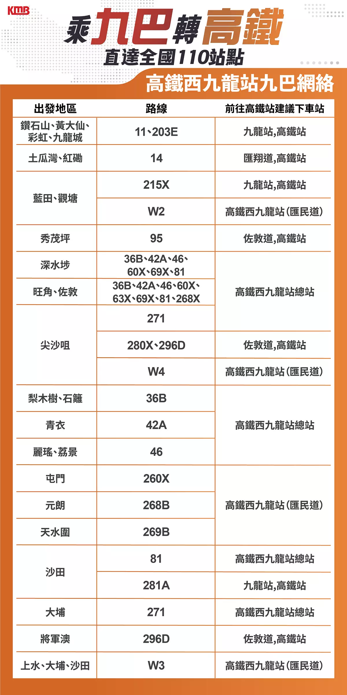 九巴於高鐵西九龍站的路線網絡覆蓋全港多區,便利市民由各區選乘九巴直達高鐵站,前往內地各大省市旅遊;由中國各地乘高鐵抵港的旅客,亦可於高鐵站鄰近的不同巴士站,選乘九巴不同路線前往各個好去處或酒店住宿。同時,為方便乘客更容易識別前往高鐵站的九巴路線,九巴將於相關路線的巴士站上加上「經︰高鐵站」的標示,讓乘客容易辨認。