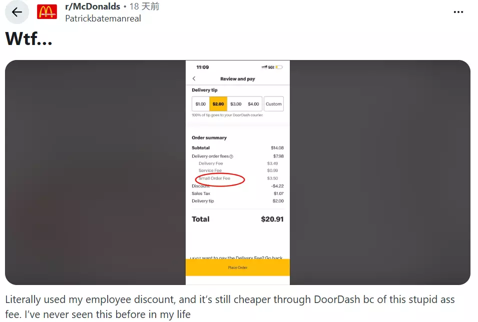 據外媒報道,一位Reddit用戶在麥當勞點餐,發現外賣訂單中附了一筆奇怪的費用;除了標準的外賣費和服務費外,還額外加收了3.5美元(約27元港幣)的「小額訂單費」(small order fee)。他說,他用了員工折扣,但因這筆愚蠢的費用,透過DoorDash訂購反而更便宜。