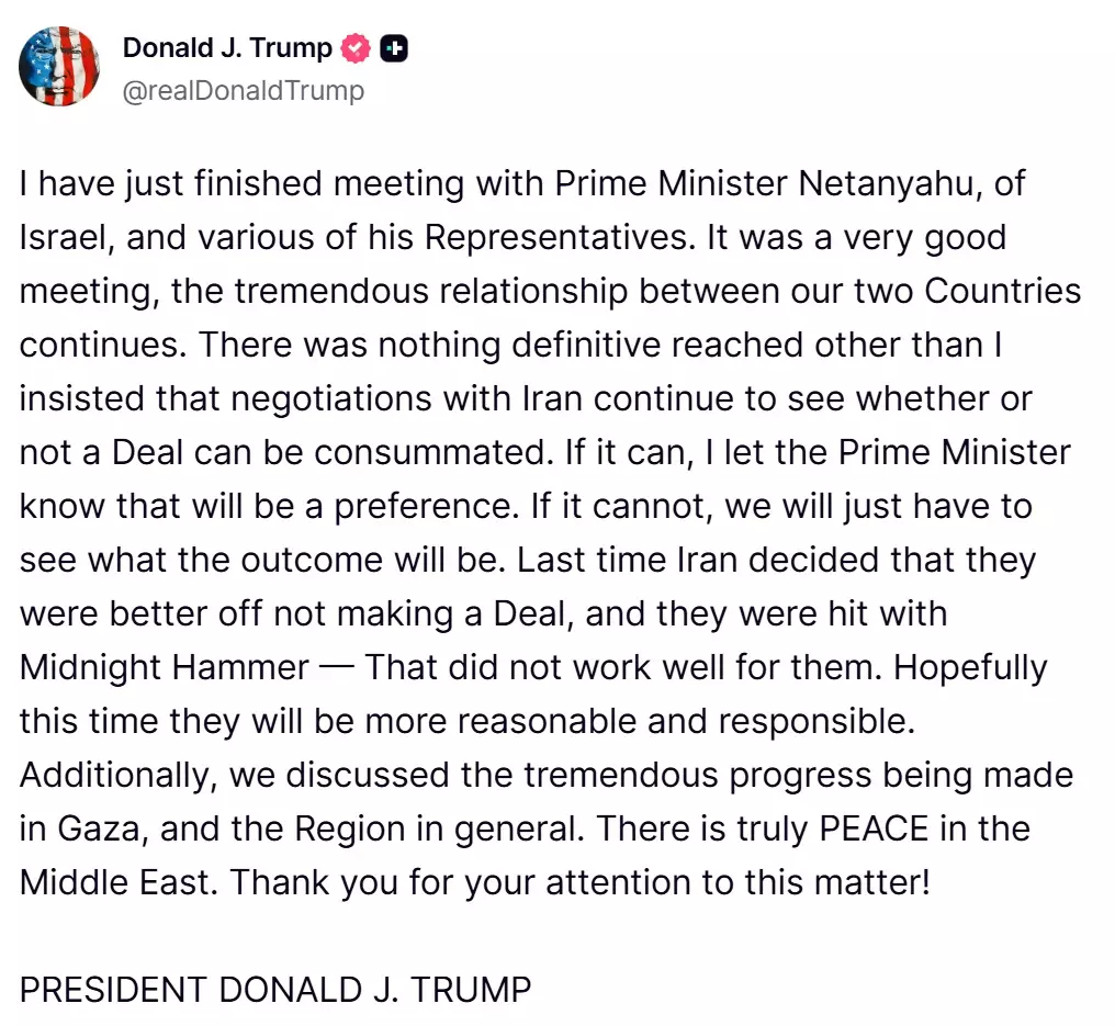 特朗普會後在社交平台上形容會談非常好,稱雙方未達成具體決定,但他堅持要求與伊朗的談判繼續進行,以期達成協議。他又說已告知內塔尼亞胡,如果能同伊朗達成協議,將是美方的首選方案。