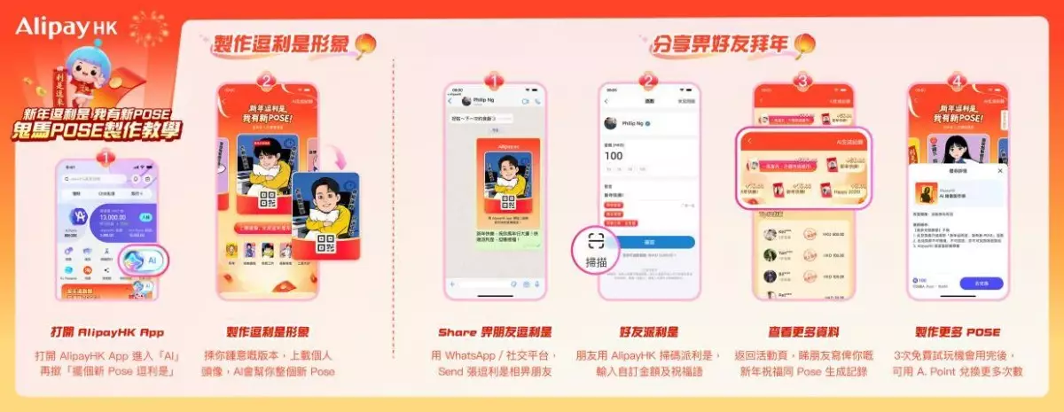 除了求籤開運,新年限定的全新 AI 趣味收款碼——「擺個新 POSE 逗利是」功能亦已登場,你可上傳自選照片生成可愛頭像,設計個人專屬的收款碼逗利是,透過社交媒體於朋友圈傳播逗利是,更為逗利是過程增添無窮樂趣與節日氣氛。