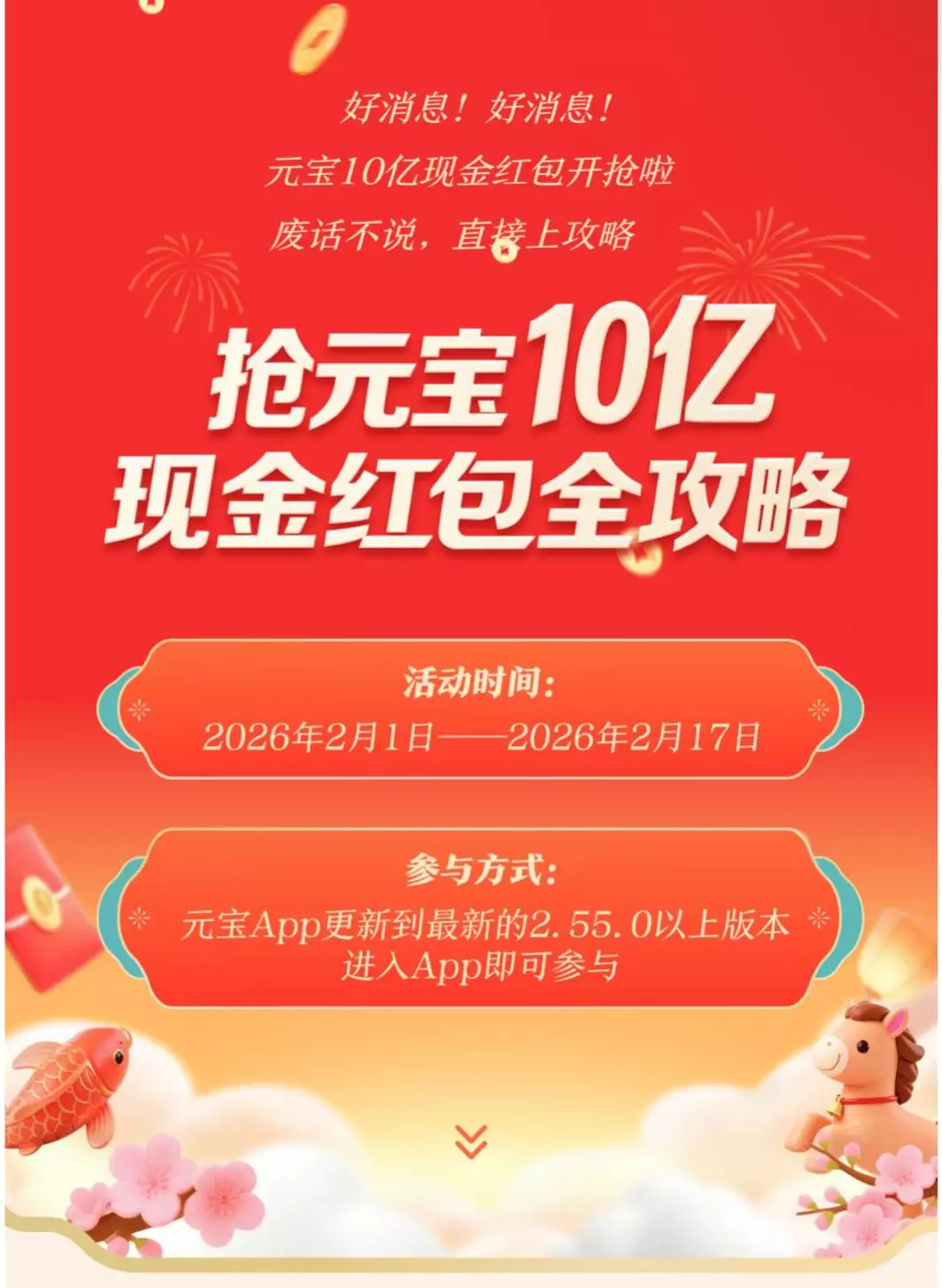 騰訊元寶App派10億元現金紅包。元寶微信公眾號圖片