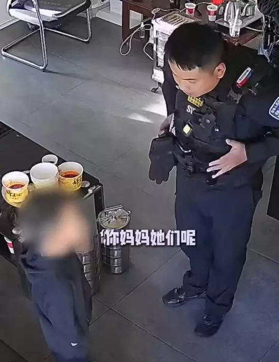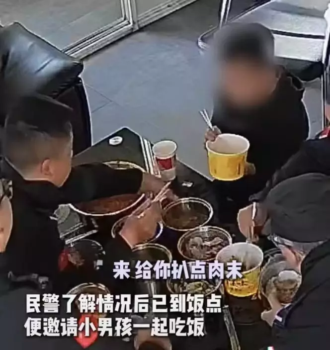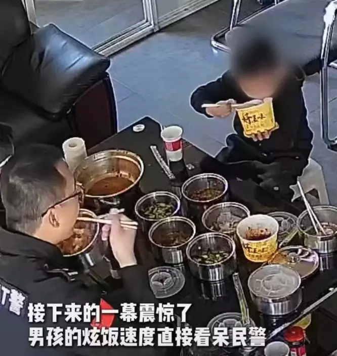 蕩失路男童到派出所求援遇到飯點,接過飯碗迅速「掃光」飯菜驚呆警員。影片截圖
