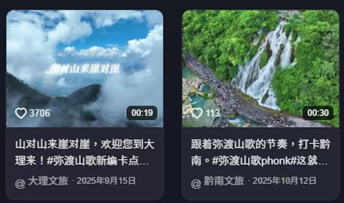 黔南文旅和大理文旅將彌渡山歌直接作為宣傳影片的背景音樂,用於推廣當地的景點和美食。此外,他們還將這首歌和雲南傳統的打歌舞組合在一起,實現了「聽山歌、跳打歌」的完整文旅體驗。
