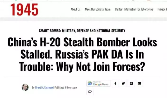 近期,美國軍事評論員伊斯特伍德於美媒發表文章稱,中國的轟-20戰略轟炸機以及俄羅斯的PAK-DA項目均「推進遲緩」,甚至隱晦表示中俄可考慮聯合研發新一代戰略轟炸機。乍一看,這好似是一項「技術合作提議」,但軍事專家剖析其邏輯,認為此說法既與現實情況有矛盾,也極大地低估了中國轟-20項目的實際定位。