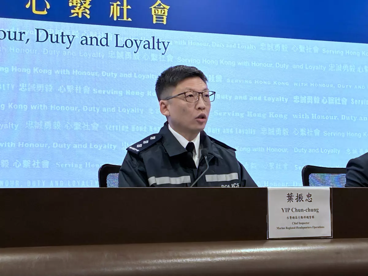 (左起)港鳥總區交通部執行及管制組總督察劉俊豪、西九龍總區交通部執行及管制組總督察鄭俊傑、水警總區行動部總督察葉振忠,以及海事處海港巡邏組署理高級海事主任黃浩君會見傳媒。