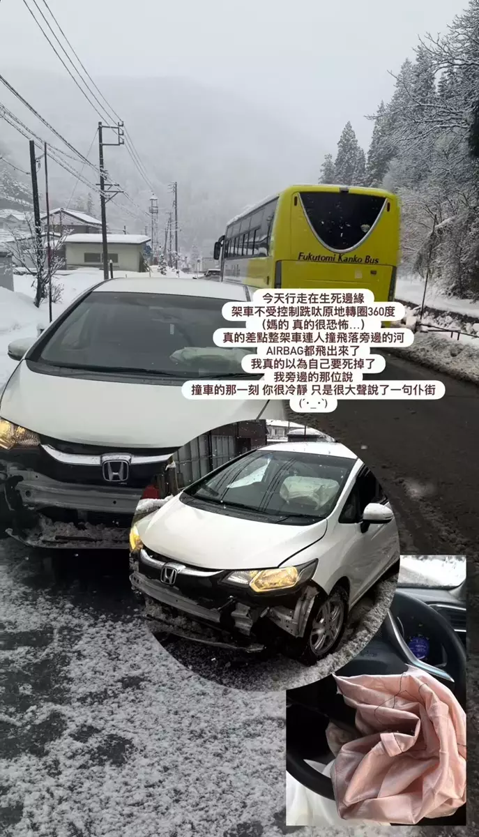 梁允瑜在IG Story分享暴雪下在公路自駕的片段,並附上她的座駕撞到車頭嚴重損毀,以及AIRBAG的照片,她表示:「今天行走在生死邊緣,架車不受控制跣呔原地轉圈360度(真的很恐怖),真的差點整架車連人撞飛落旁邊的河,AIRBAG都飛出來了,我真的以為自己要死掉了,我旁邊的那位說:撞車的那一刻,你很冷靜,只是很大聲說了一句X街。」好彩人無事,可謂有驚無險!其後,梁允瑜再展示手臂的瘀傷,並透露撞車沒有受傷反而滑雪受了傷,「滑完雪返到酒店先發現撞到瘀晒,叻女瑜。」