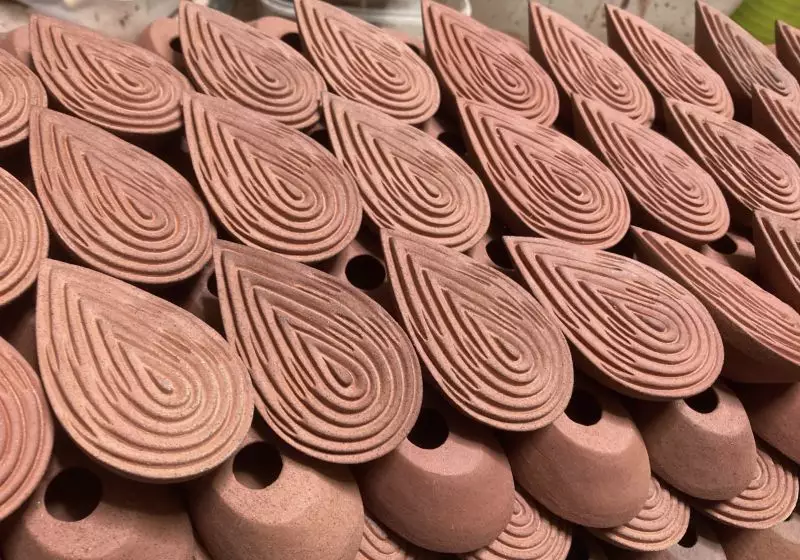 作品圍繞大自然的兩種形態,一種象徵葉子,另一種則象徵花朵,每件陶瓷皆由他親手製作,從黏土塑形開始,再用紅色陶土注漿成型,並刻意不上釉以呈現物料原始的質感和色澤,Setyawan 稱之為「烤土」(Baked earth)。這件作品巧妙地利用光影層疊,營造出層次豐富的效果,模糊了雕塑與牆壁的邊界,隨觀者移步換景而呈現多重面貌。