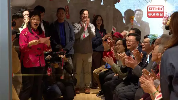 勞工及福利局局長孫玉菡、民政及青年事務局局長麥美娟陪同李家超落區。他們在長者中心期間,欣賞長者表演又向他們派揮春。