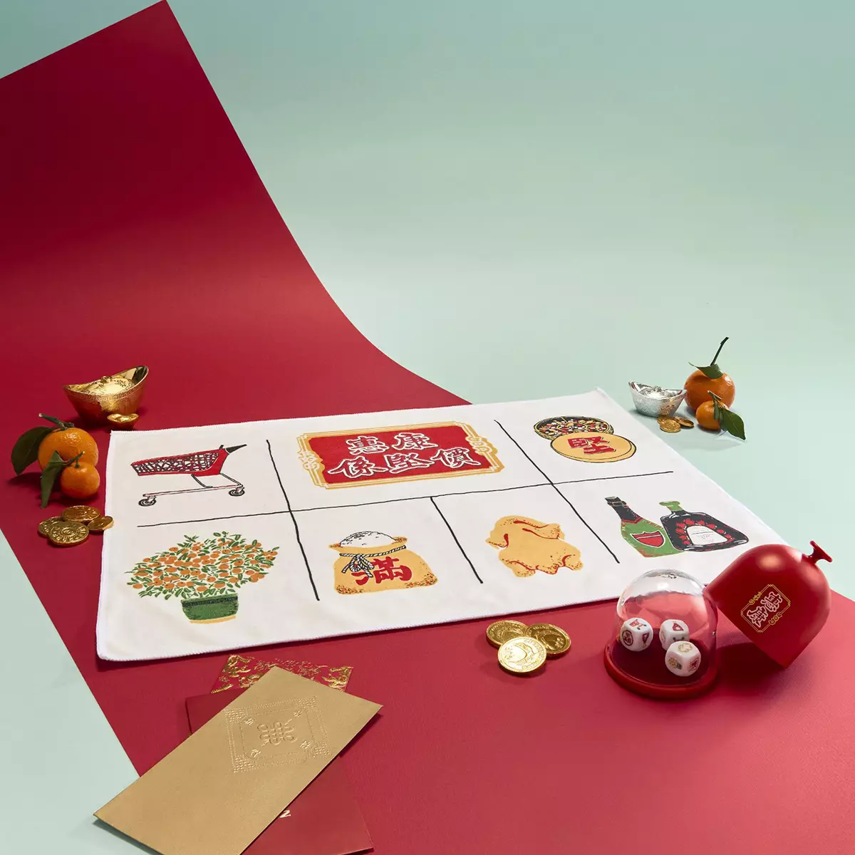 重新詮釋傳統的魚蝦蟹遊戲,打造趣味「惠康超市版」賀年遊戲!設計以活潑的手繪線條,配合超市常見的食材與日用品巧妙轉化為遊戲圖案。整體設計以經典的紅色、富現代感的橙金為主調,骰盅也特別採用惠康標誌性的紅色,適合全家大小同樂,歡度新春。