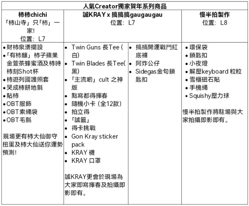 除了大麻成外,年廿五至年廿九的年宵市集特別場誠邀多位人氣Creator參與,屆時柿柿chichi、誠KRAY、搞搞搞gaugaugau、慢半拍製作、DDED、東尼電機、Johnee等將設置年宵攤檔,帶來多款首度曝光的獨家賀年系列商品,期間更會突發快閃擔任檔主,親臨現場與粉絲近距離互動,想捕獲他們的粉絲們要密切留意社交平台發放的最新情報!
