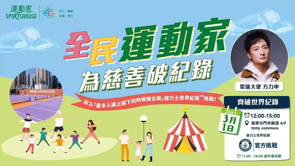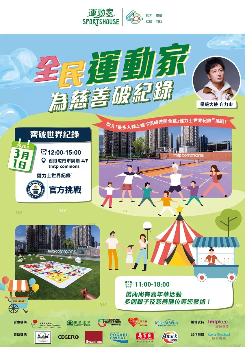 運動家今年迎來40周年的重要里程碑,並特別邀請著名運動員兼歌影視藝人方力申(Alex)擔任活動大使,於3月1日(星期日)假屯門市廣場tmtp commons帶領全港市民參與「運動家40周年全民運動挑戰日」,一同挑戰健力士世界紀錄™。活動誠邀1,000名市民線上線下同步參與,凝聚社區力量,攜手為香港締造前所未有的紀錄時刻。