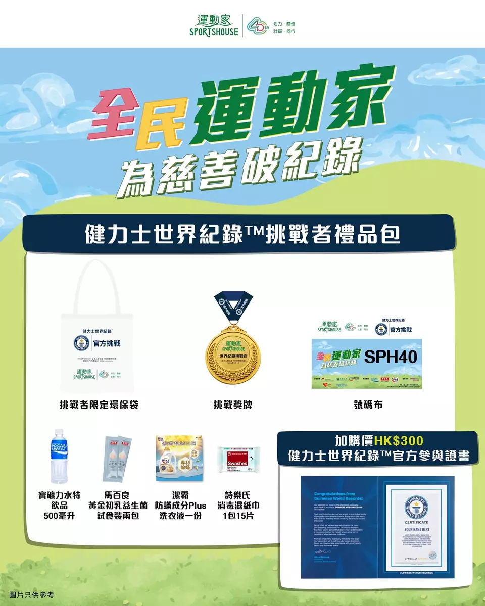 挑戰者專享禮品:為紀念運動家40周年,所有線上線下的參加者均可獲得「健力士世界紀錄™挑戰者禮品包」(乙份)。