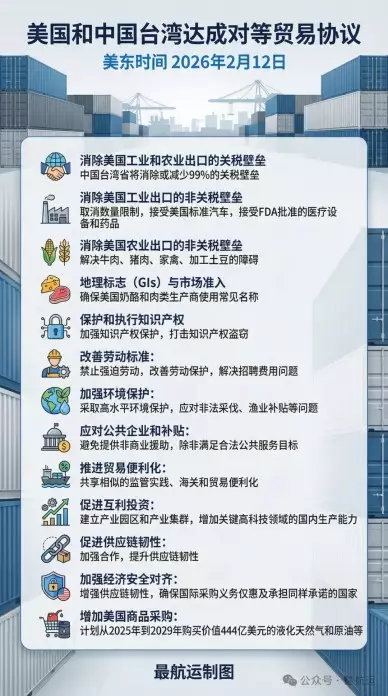 美國東部時間2月12日(本港時間13日清晨),美國與台灣當局在華盛頓正式簽署了所謂的「對等貿易協定」。表面上看,台北當局大肆宣傳成功爭取輸美商品平均關稅從原先恐達的 35.78% 大幅降至 15%,是一項「重大外交成果」,更將其包裝成雙方關係的里程碑。然而,若我們剝開這層「互惠」的金粉包裝,仔細審視協議條款,便會發現這實質上是華盛頓向台北開出的一張天價「保護費」賬單。