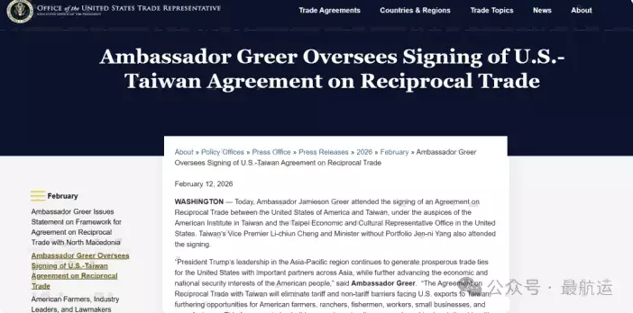 然而,言猶在耳,華盛頓顯然將這些警告置若罔聞。在特朗普重返白宮並高舉「美國優先」大旗的當下,美方執意在 2月12日 正式簽署協議,視北京的紅線如無物。在美國眼中,台灣不過是其收割經濟利益、在第一島鏈圍堵中國大陸的一枚棋子——而且是一枚自帶乾糧、搶著買單的棋子。