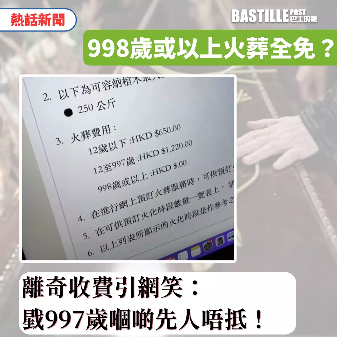 日前有殯儀業從業員截圖食環署網頁有關「火葬費用」一項的內容,其顯示12至997歲為1,220元,998歲或以上則為「HKD $.00」。直言「香港生存的確唔容易,原來要活到998歲,市民先可以享有免費火化服務。」帖文引起逾萬名網民熱議。