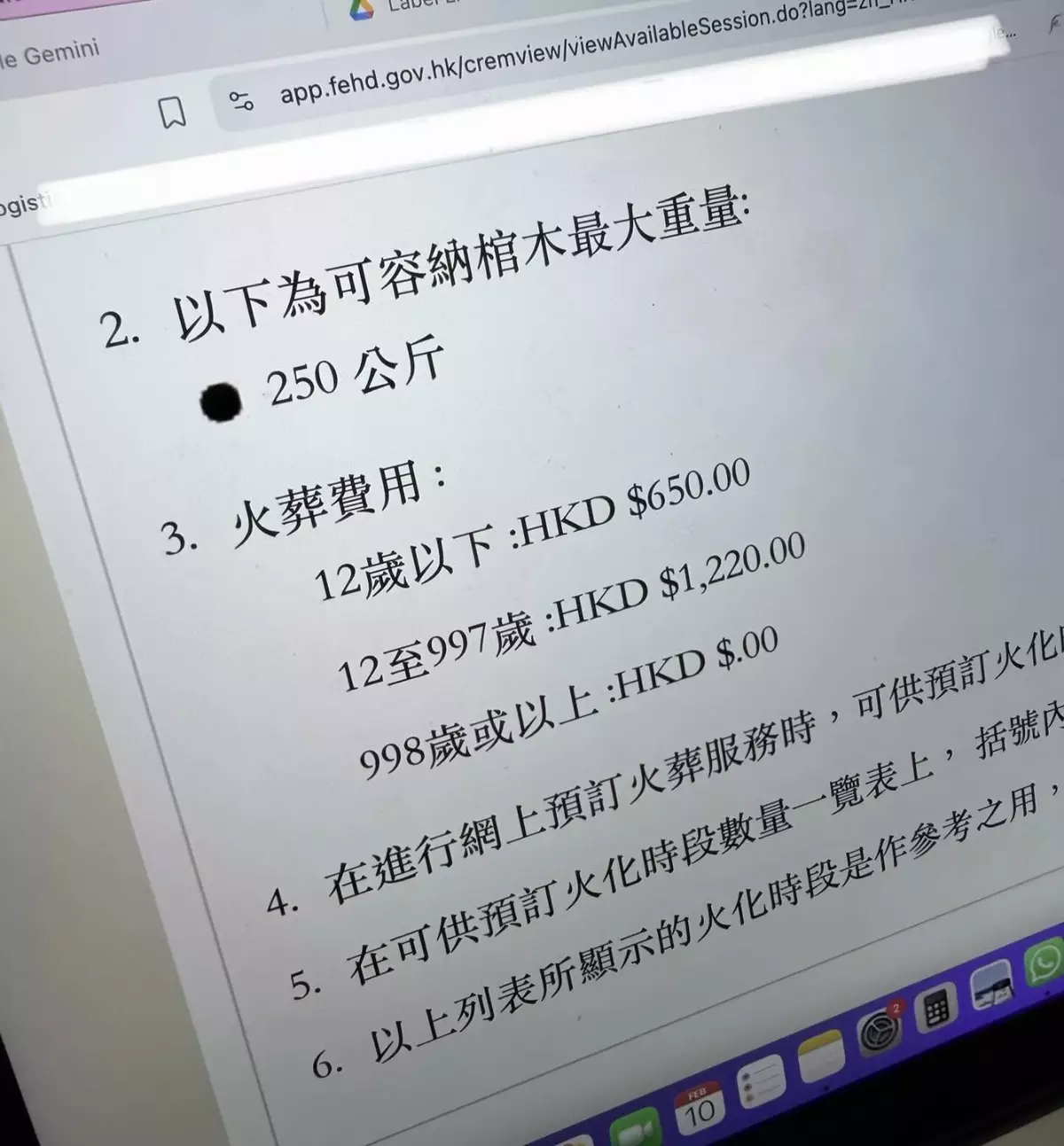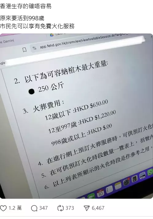 日前有殯儀業從業員截圖食環署網頁有關「火葬費用」一項的內容,其顯示12至997歲為1,220元,998歲或以上則為「HKD $.00」。直言「香港生存的確唔容易,原來要活到998歲,市民先可以享有免費火化服務。」帖文引起逾萬名網民熱議。