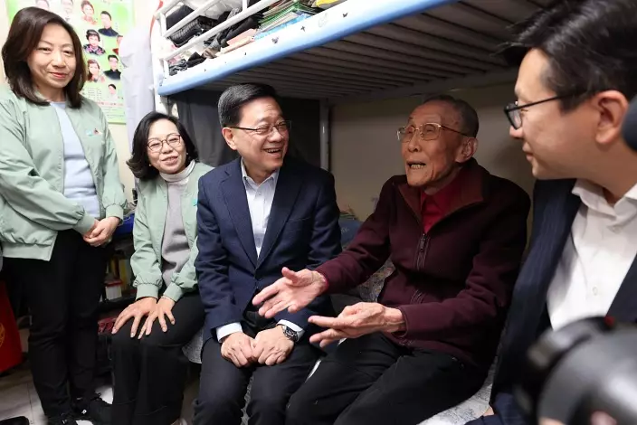 超哥在勞工及福利局局長孫玉菡、民政及青年事務局局長麥美娟、房協主席凌嘉勤陪同下,到油麻地駿發花園探訪了一名獨居的91歲伯伯坤叔、同另一戶年過八旬的彩姐夫婦;另又參觀了屋苑內的長者地區中心,與一群「老友記」玩遊戲唱歌仔講近況。