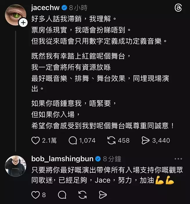 Jace亦向粉絲真摯喊話:「如果你唔鍾意我,唔緊要;但如果你入場,我希望你會感受到我對呢個舞台嘅尊重同誠意。」短短一段說話,不少網民大讚她高EQ、夠真,認為她沒有粉飾太平,而是勇敢面對現實,同時堅持初心。