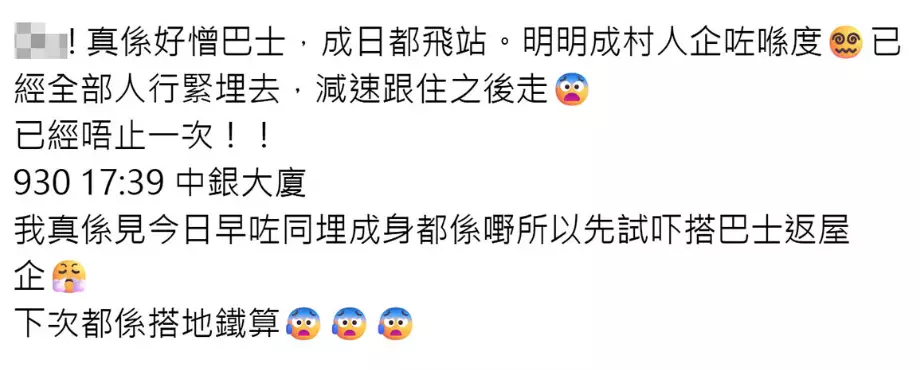 女事主在社交平台發文,指在金鐘中銀大廈巴士站候車時,目睹目標巴士減速埋站,正當她與其他乘客步出馬路準備登車之際,巴士卻未開門便駛離站頭。事主抱怨巴士「飛站」,形容當時情況令人錯愕。