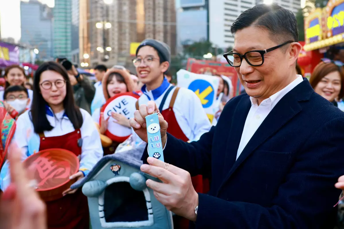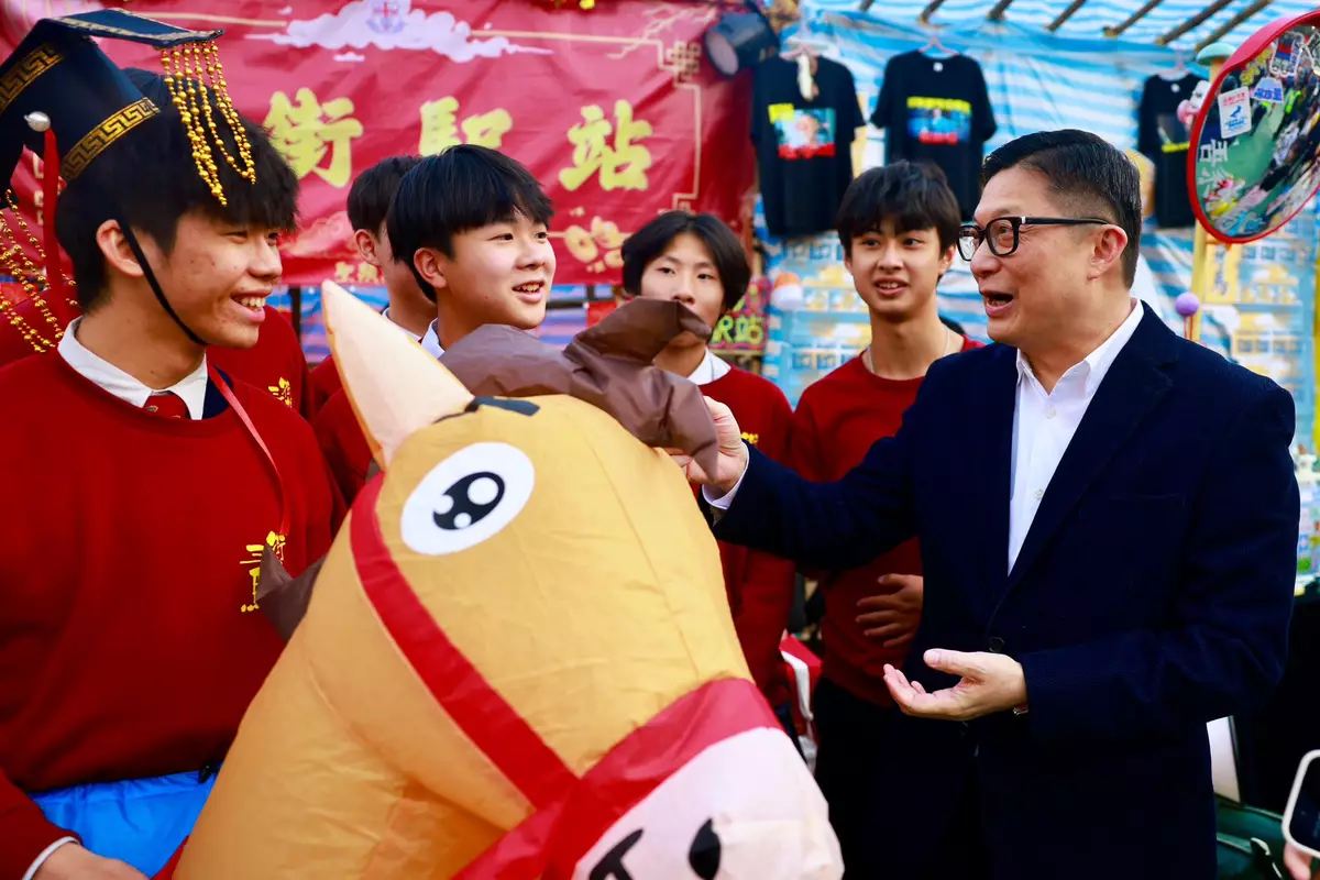 鄧炳強表示,不經不覺下星期就是農曆新年。他表示經過辦公室接待處,見到有同事拍照,原來今年除了擺攢盒,還有策馬奔騰的保安大小熊,立即成為辦公室打卡點,更說要為同事的創意點讚。