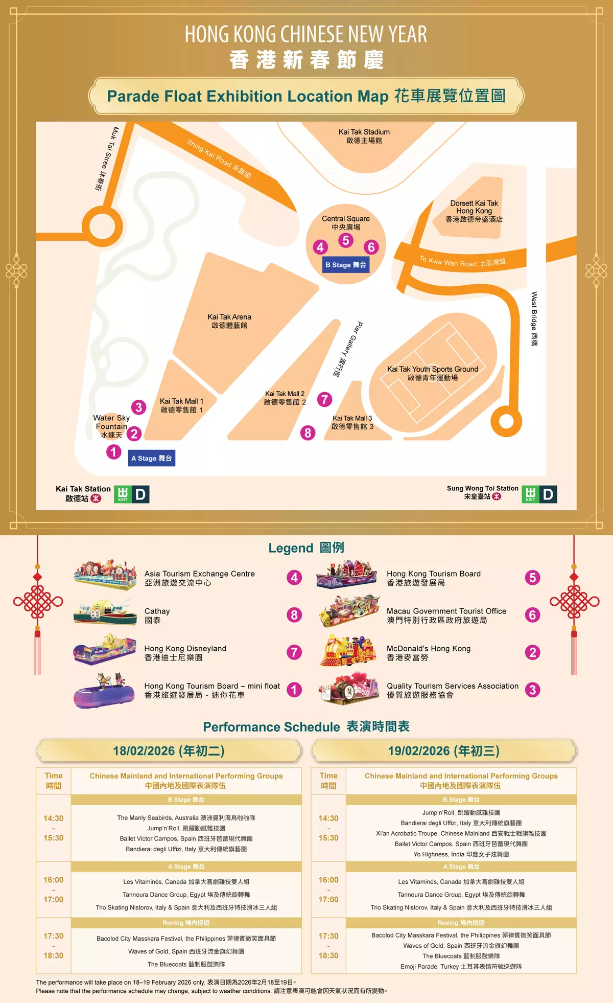 為延續匯演的喜慶氣氛,由年初二(2月18日)起,多輛花車將首度於啟德體育園展出,參與匯演的多支國際及本地表演團隊亦會於年初二及年初三(2月18日及19日)在園區內即場獻技,讓市民及旅客在節日期間繼續感受濃厚的新春氛圍。