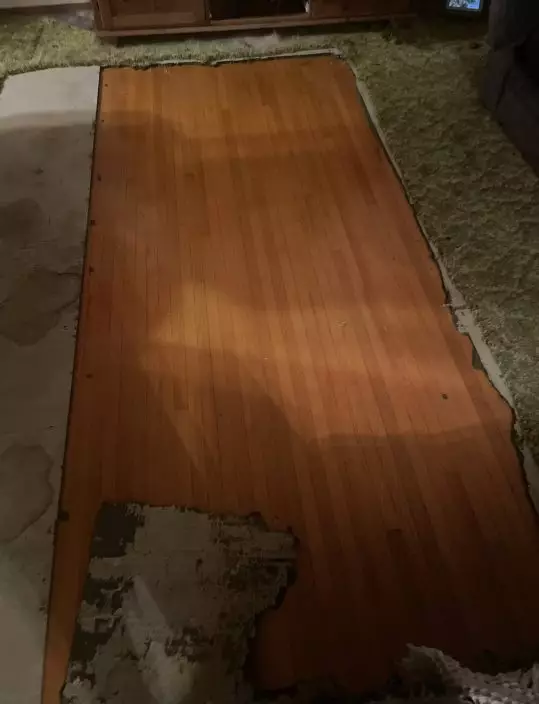 女子因愛犬咬毀地毯意外揭開地板下暗藏完整「硬木地板」。Threads圖片