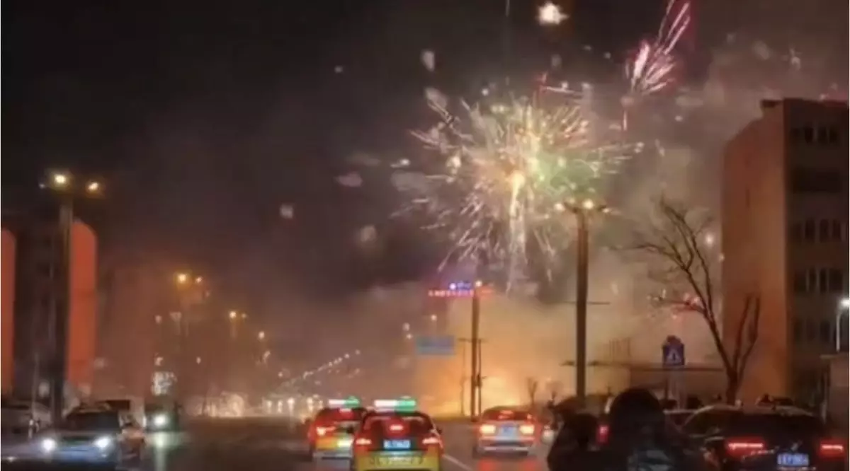 遼寧攤販鞭炮被接連引爆,響徹夜空半小時變煙火表演。影片截圖