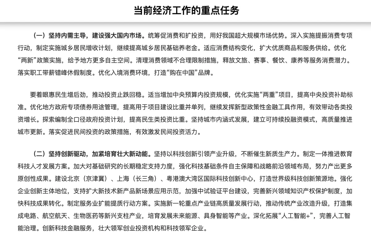 文章是習近平25年在中央經濟工作會議上講話的部分內容,指要堅持內需主導,建設強大國內市場,統籌促消費和擴投資,用好超大規模市場優勢。包括擴大優質商品和服務供給,釋放文旅等服務消費潛力,推動投資止跌回穩,適當增加中央預算內投資規模,繼續發揮新型政策性金融工具作用等。