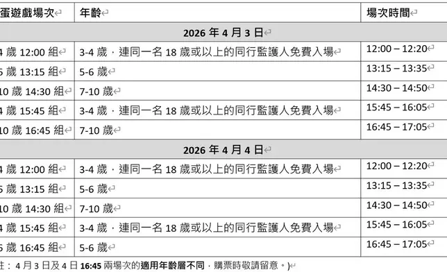 獵蛋時間:中午 12 時至下午 5 時 05 分 (各年齡組別劃分不同時段進行)