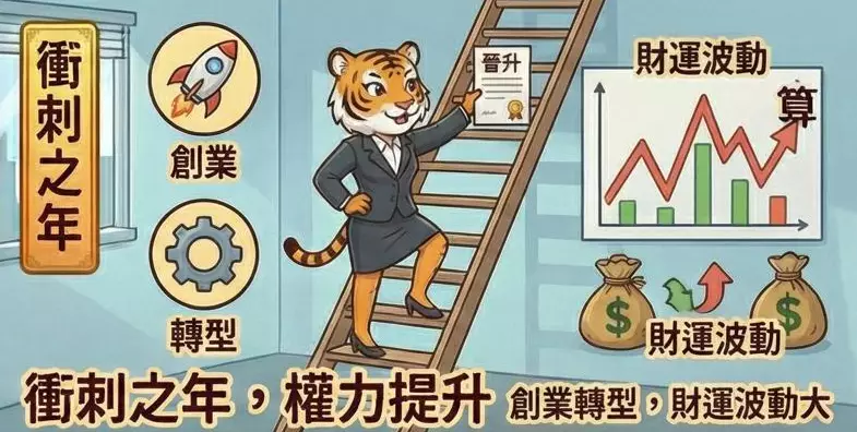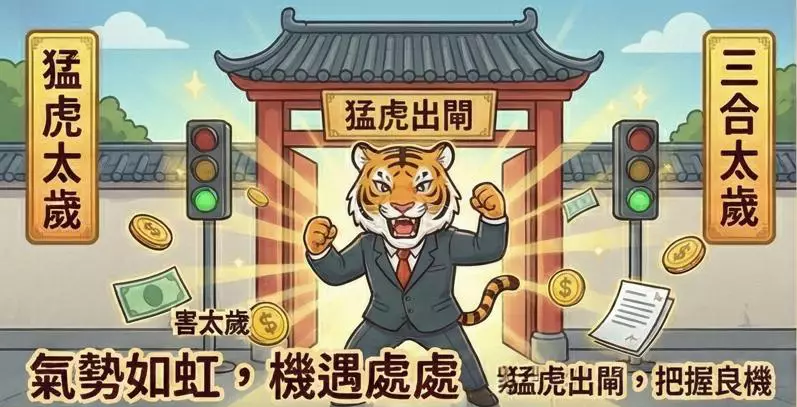 2026年對屬虎者是衝刺之年,事業有突破機會,尤其在創意、銷售或創業領域表現突出。財運波動較大,宜設立預算控管,避免衝動消費。感情運佳,單身者易遇正緣,已婚者需注意溝通避免誤會。健康注意心臟與情緒管理,可透過冥想或戶外活動紓壓。
