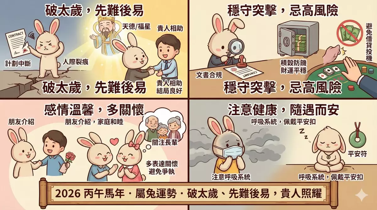 踏入2026丙午馬年,對於屬兔的朋友來講,今年是「破太歲」之年,主要是「破壞」同「裂痕」的意思,即計劃容易被打斷、合作容易生誤會、人際關係容易有暗湧。