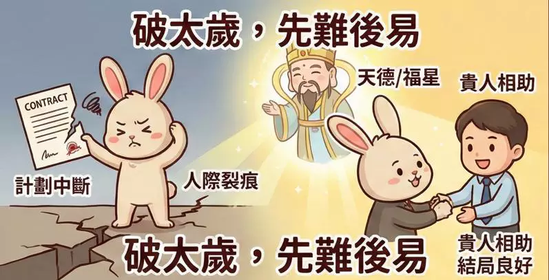 屬兔者今年「破太歲」,代表「破壞」與「人際裂痕」。原本計劃好的事情容易中途生變,或與合作夥伴發生因財失義的情況。幸好有「天德」與「福星」照耀,雖然過程波折,但結局通常是好的 。今年適合穩守突擊,不宜進行高風險的巨額投資,簽署文件時務必看清條款,以免因文書疏忽而惹上官非。