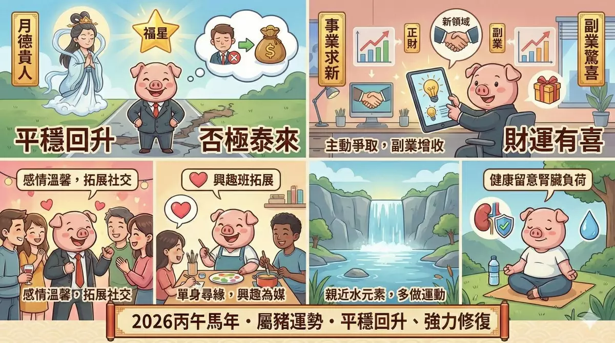 屬豬者擺脫了蛇年的沖太歲,馬年運勢顯著回升。有「月德」(或類似貴人星)照耀,象徵具有強大的修復能力,過去一年的人際誤會或財務虧損,今年有望得到解決與填補 。事業上將迎來新的合作機會,思緒清晰,靈感豐富。這是一個適合整頓步伐、蓄勢待發的年份,整體生活將重回正軌,心情也隨之開朗。