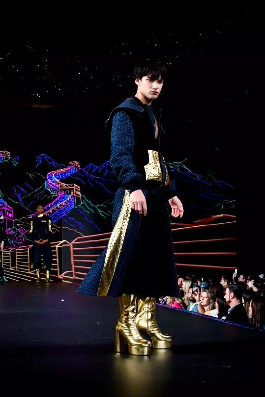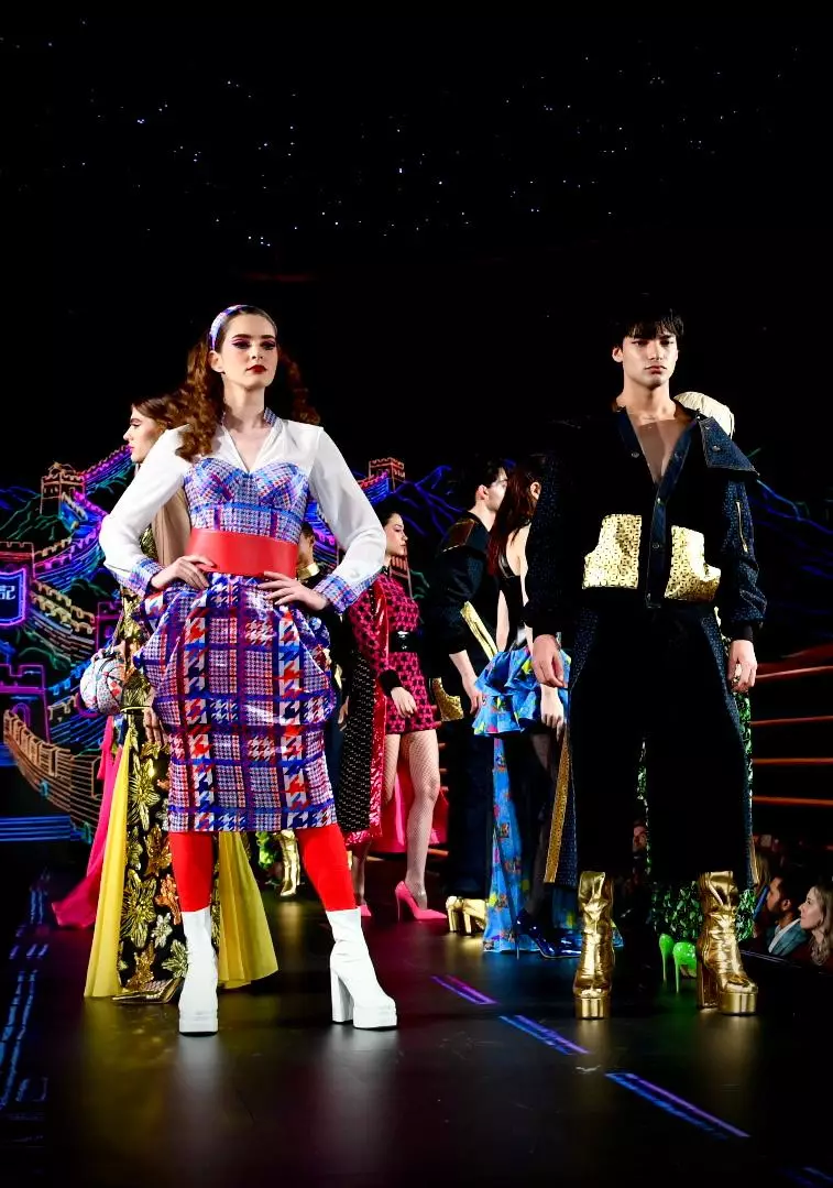 以彩色霓虹線條勾勒出的萬里長城與香港夜景,將古代邊塞與現代都會結合,營造出歷史與當下重疊,如同穿越時空的視覺場景。在強烈光影襯托下,3 套以牛仔靛藍與金色為主調 的 SPARKLE byKAREN CHAN「尋泰記電影」 聯乘男裝新派牛仔華服以皇者之姿列陣登場,跨越千年的文化在國際舞台上化作鮮明前衛的輪廓。