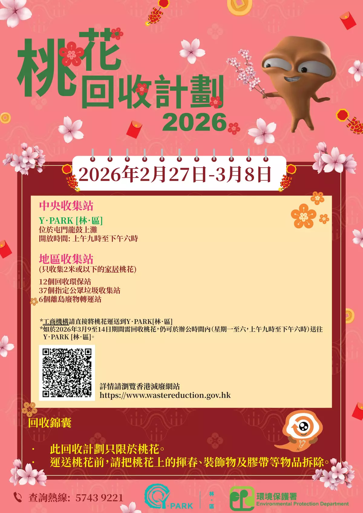 環保署公布今年桃花回收計劃將於農曆新年假期後舉行,由本月27日至下月8日, 收集地點位於Y‧PARK[林‧區]的中央收集站及55個地區收集站,包括「綠在區區」12個回收環保站、6個離島廢物轉運設施及37個公眾垃圾收集站。由下月9日至14日, 市民及工商機構可於辦公時間內將桃花直接送往Y‧PARK[林‧區]。