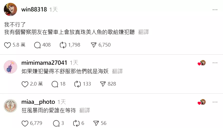 有網友分享他的警察朋友會在警車上放日本動畫《唱K小魚仙》的歌給疑犯聽,網友笑說「如果嫌犯覺得不舒服那他們就是海妖。」