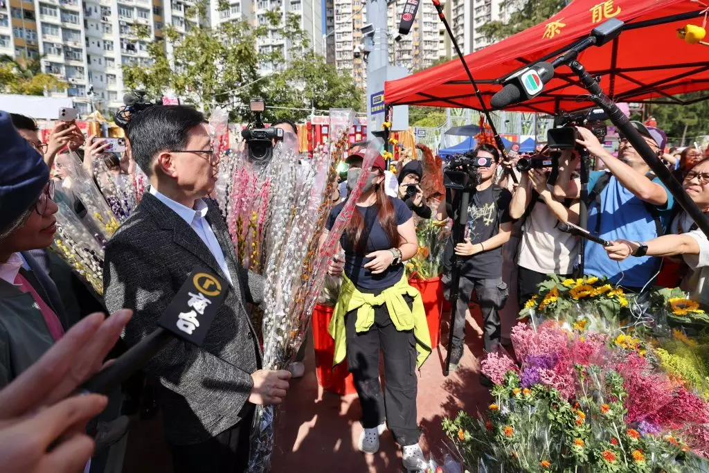 星期一(2月16日)是年廿九除夕,行政長官李家超下午3時再度落區,在民政及青年事務局局長麥美娟、環境及生態局局長謝展寰陪同下,到訪觀塘遊樂場的年宵市場逛花市,與市民交談和了解檔戶的生意情況。